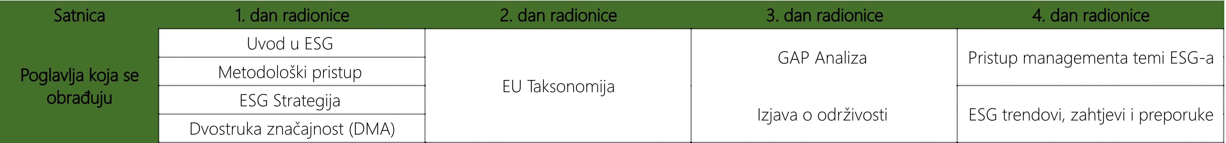 Radionica je podijeljena na 9 poglavlja koja obuhvaćaju ključne elemente za razumijevanje konteksta, regulatornih zahtjeva i primjene ESG-a